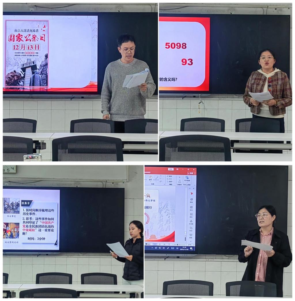 曲阜师范大学马克思主义学院马士花、春秋小学董哲、田家炳中学刘赟、我校张驰等4位老师围绕活动主题分学段进行了模拟授课,对抗战历史脉络、抗战精神内涵及时代价值、青年学生的责任担当进行了详实的论述。随后,各学段备课团队分别对四节课从框架流程、课程内容、方法策略等方面进行深入交流探讨,明确改进方向和措施。