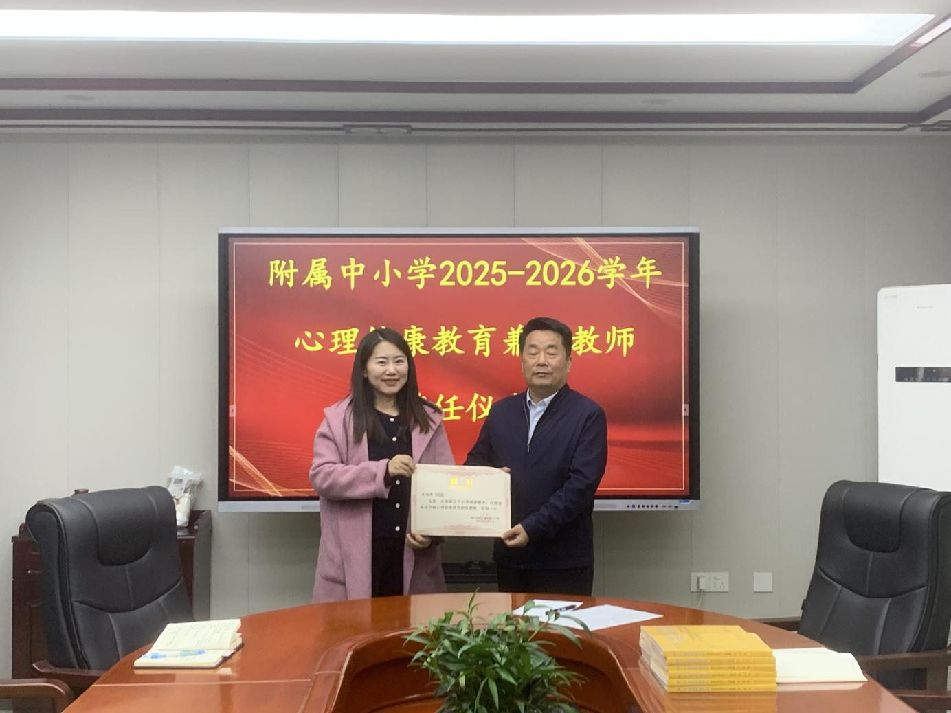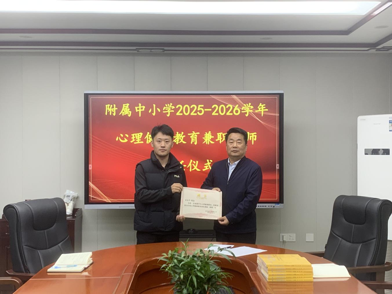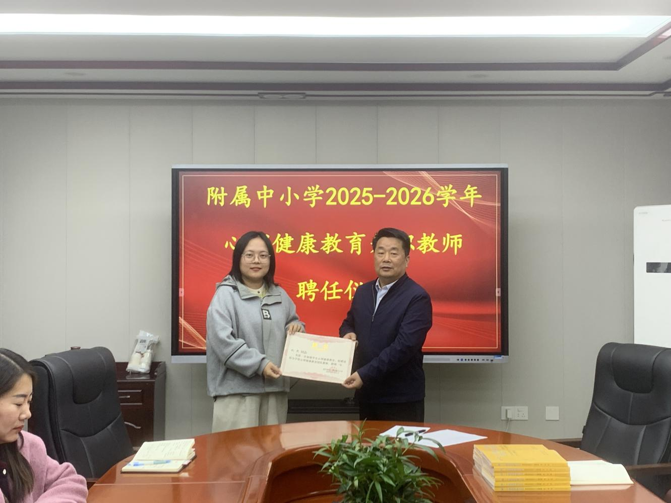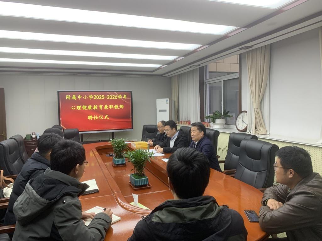 为加强学校心理健康教育服务体系专业化建设,为学生健康成长提供更加坚实有力的支持,11月11日,我校在笃行楼二楼会议室举行了心理健康教育兼职教师聘任仪式。党委委员、纪委书记、副校长谢印智,学生工作处副主任康鲁生,初中部和高中级部副主任魏洪猛、刘文衡、孔庆典、闫斌及受聘教师出席了仪式。聘任仪式由学生工作处主任尹弘震主持。