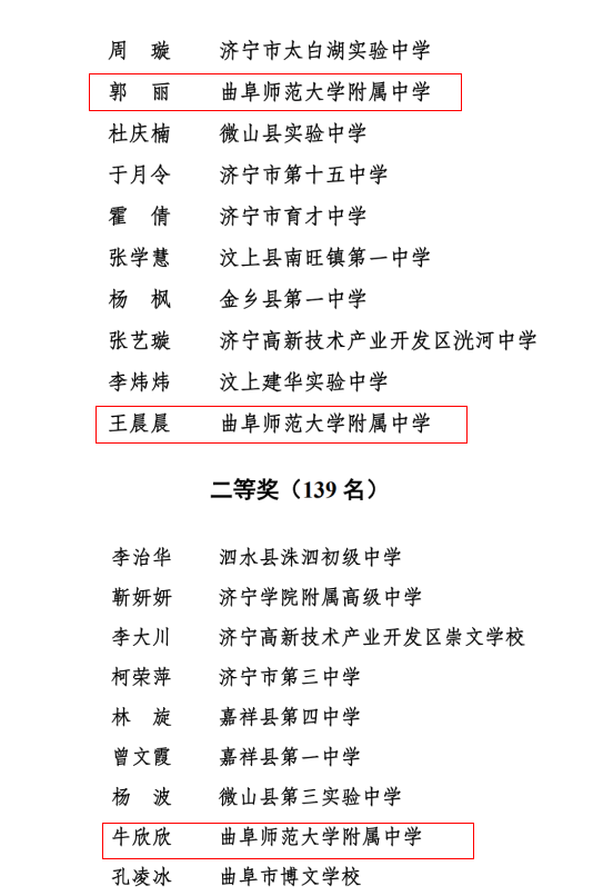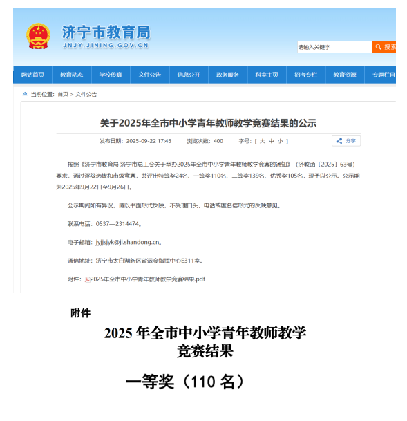 近日,济宁市教育局公布2025年全市中小学青年教师教学竞赛结果,我校教师郭丽、王晨晨获一等奖,牛欣欣获二等奖。
