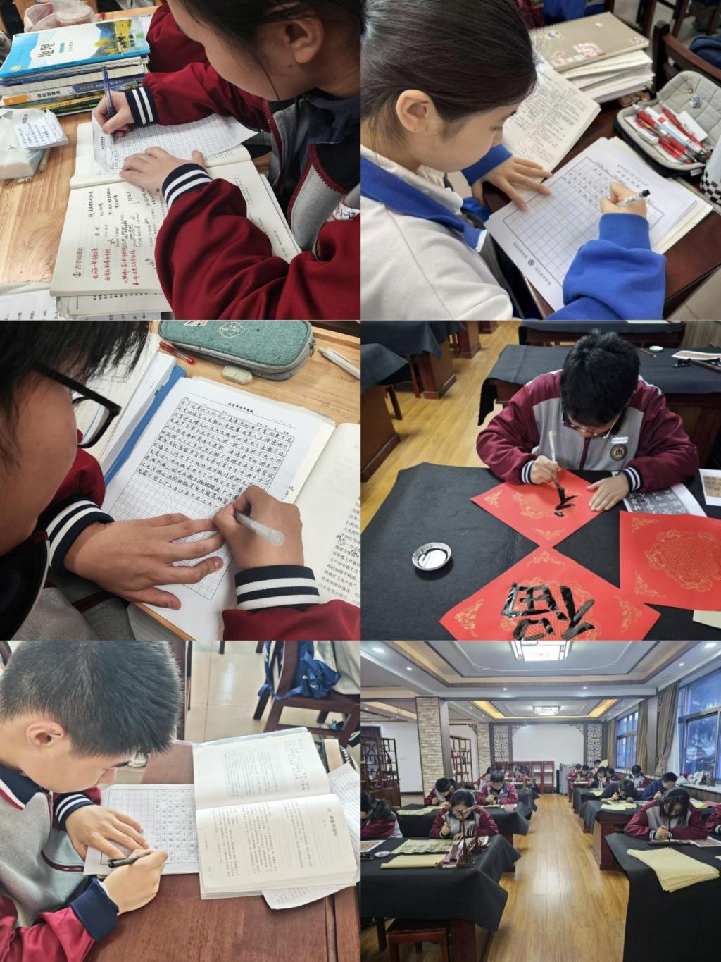 各级部同步响应文件“统筹一、二课堂作用”的要求,将规范书写练习落到实处:高中部结合学生学业特点,固定于每日晚自习开始前设立“静心练字一刻钟”活动;初中部利用每日课前五分钟开展“课前一首诗,规范书写练”活动,同时开设专业书法指导课,以学段适配的举措确保练字活动制度化、常态化。